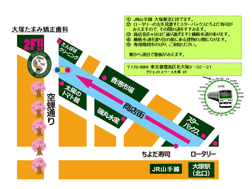 巣鴨や池袋、文京区付近で通える矯正歯科をお探しの方がいらっしゃいましたら、最寄り駅から徒歩圏内で通える大塚たまみ矯正歯科はいかがでしょうか。 当院は、JR山手線・都電荒川線「大塚駅」北口から徒歩4分ほどの場所にございます。 大塚駅の北口のロータリーから左手側・ちよだ寿司とスターバックスの間の商店街をまっすぐに進んでいただくと、空禅橘通り北の交差点が見えてまいります。その前の建物の2階が当院となります。 大塚たまみ矯正歯科は、巣鴨や池袋近隣、文京区にお住まいの方はご来院しやすい立地にございますので、ぜひ当院にご相談ください。池袋近郊の矯正歯科に通うなら、最寄り駅から徒歩4分と通いやすい場所にある当院をお選びください。